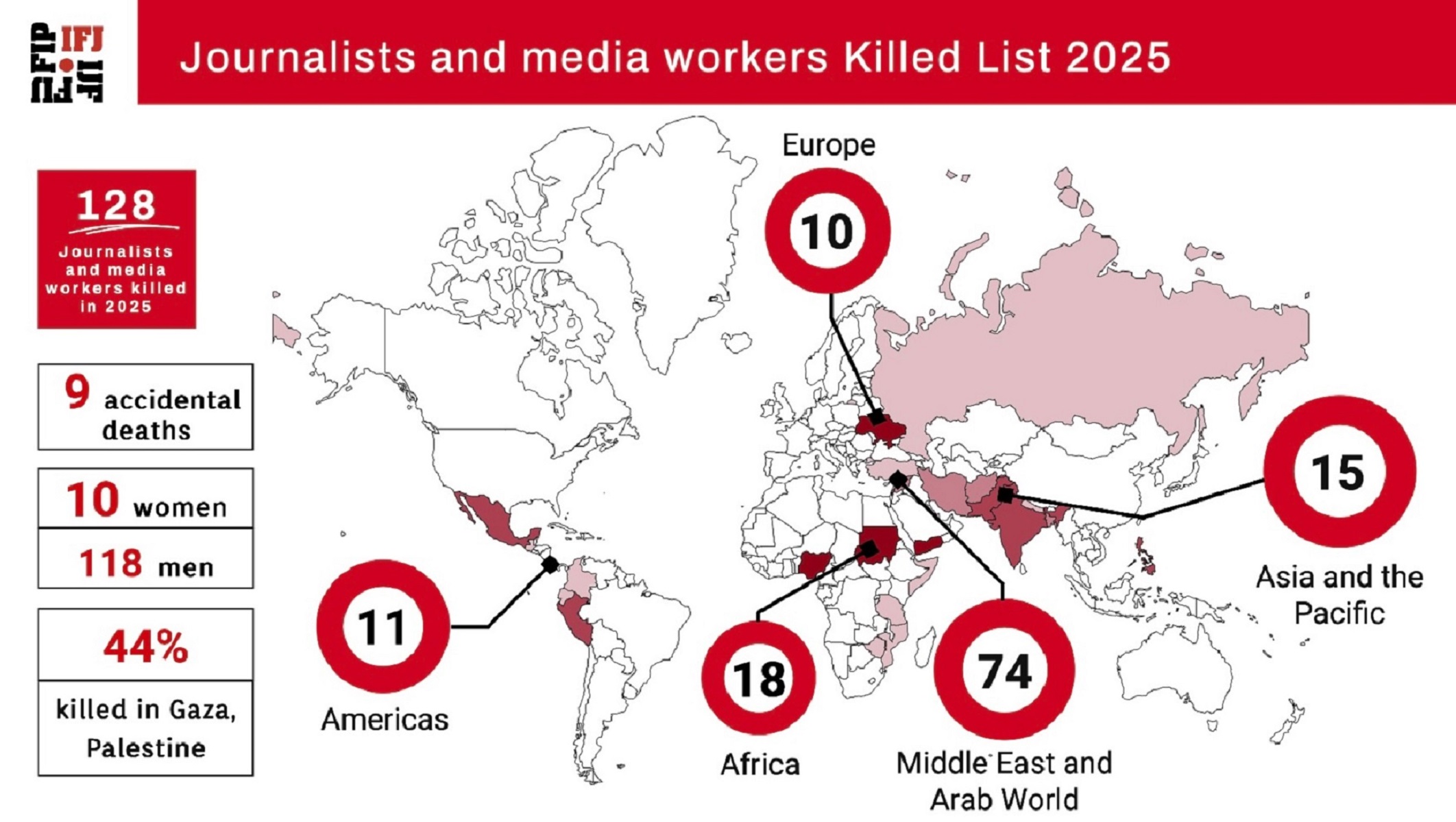 La lista actualizada incluye diecisiete casos adicionales confirmados después del 10 de diciembre, lo que pone de relieve un año especialmente mortífero para el periodismo y la persistencia de la impunidad. La Federación había publicado una lista preliminar el 9 de diciembre, en la que se registraban 111 personas periodistas y profesionales de los medios asesinadas, incluida una muerte accidental. La lista del 31 de diciembre tiene en cuenta las muertes adicionales ocurridas en Palestina, Tanzania, Perú y Guatemala, así como las muertes accidentales de siete profesionales de los medios de comunicación en Nigeria, una en Burundi y otra en Irán, además de otros asesinatos que han sido señalados a la atención de la Federación.